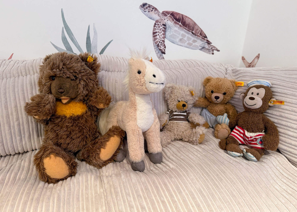 Eine kleine Kindheitserinnerung von Nina: „Mein erstes richtiges Kuscheltier war ein kleiner Steiff-Teddy. Ich habe ihn überallhin mitgenommen – auf Reisen, zum Einschlafen, sogar in den Kindergarten. Auch wenn er heute ein bisschen zerzaust ist, hat er seinen Platz in meinem Herzen nie verloren.“ Diese besondere Verbindung zu einem Kuscheltier kennt fast jeder von uns und genau deshalb zieht Steiff nun bei Bambolino in Fulda ein.
